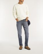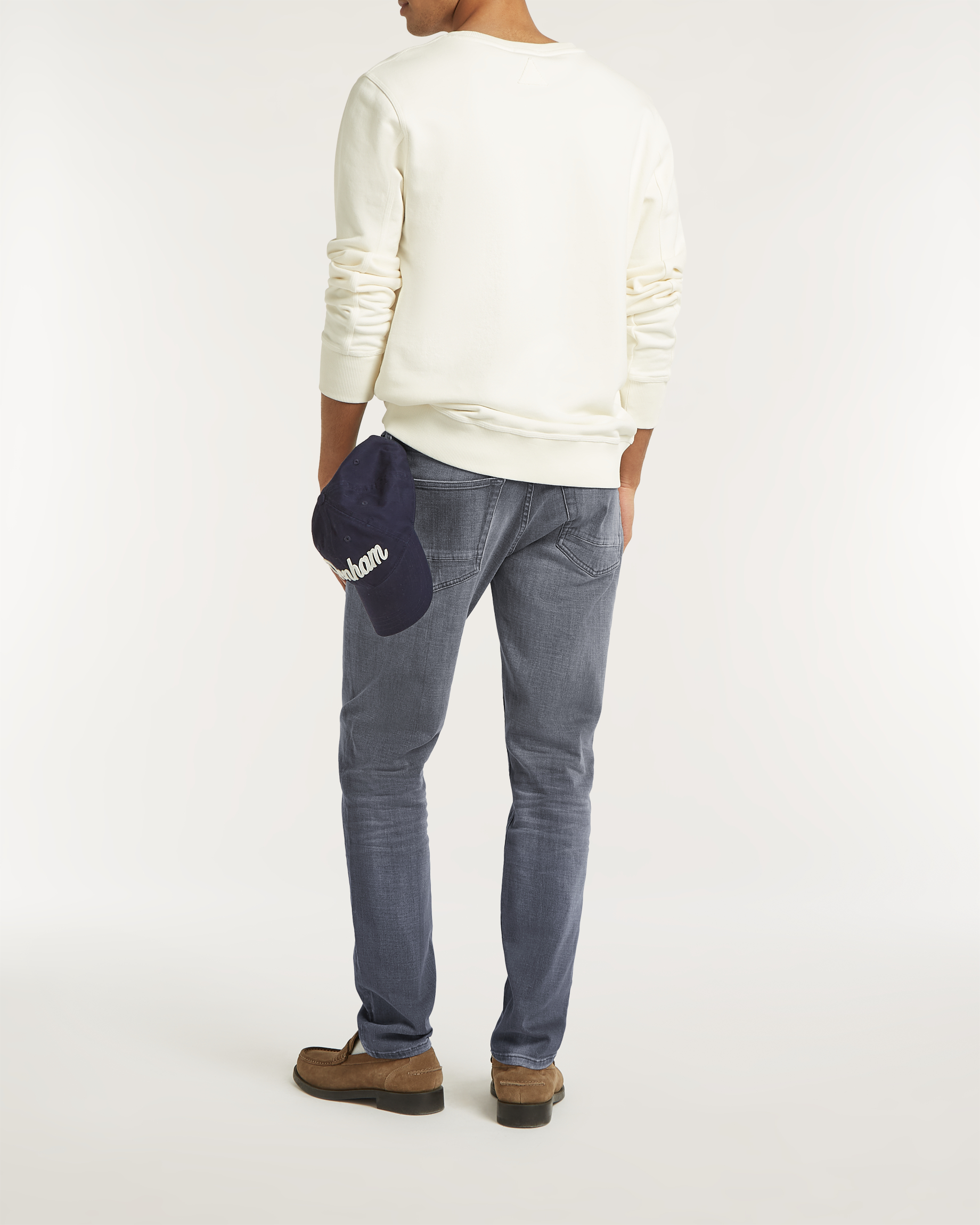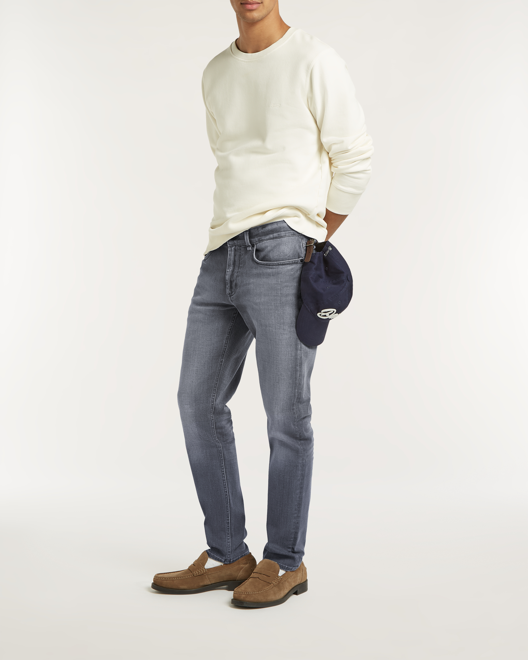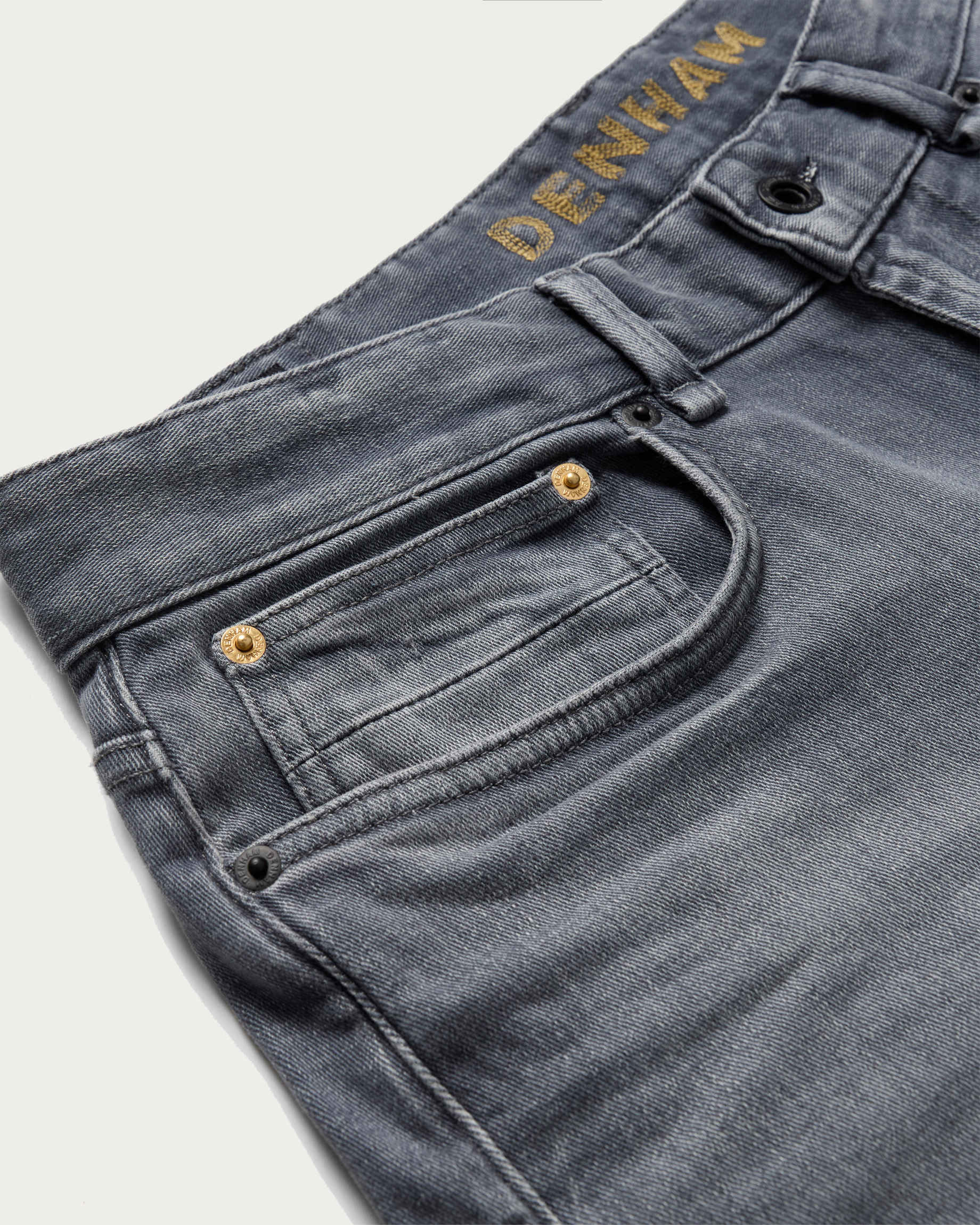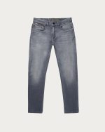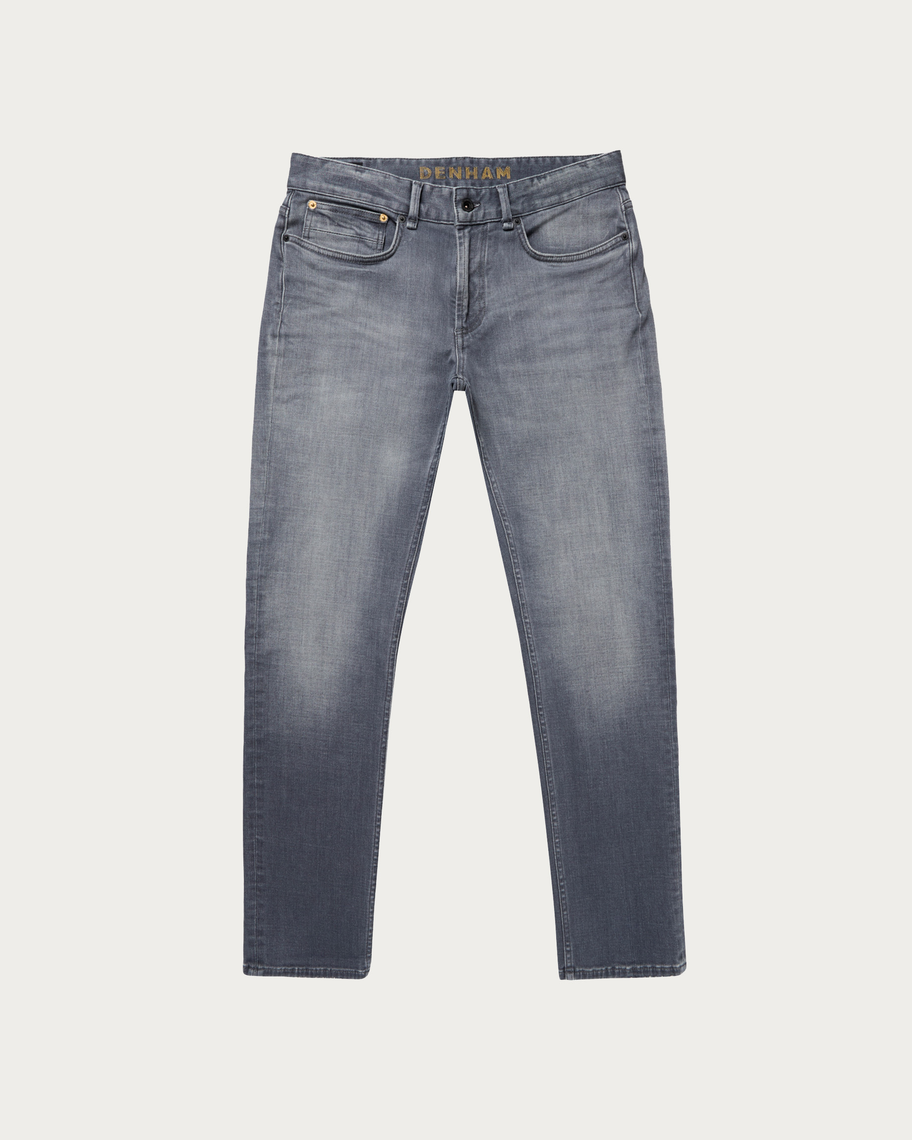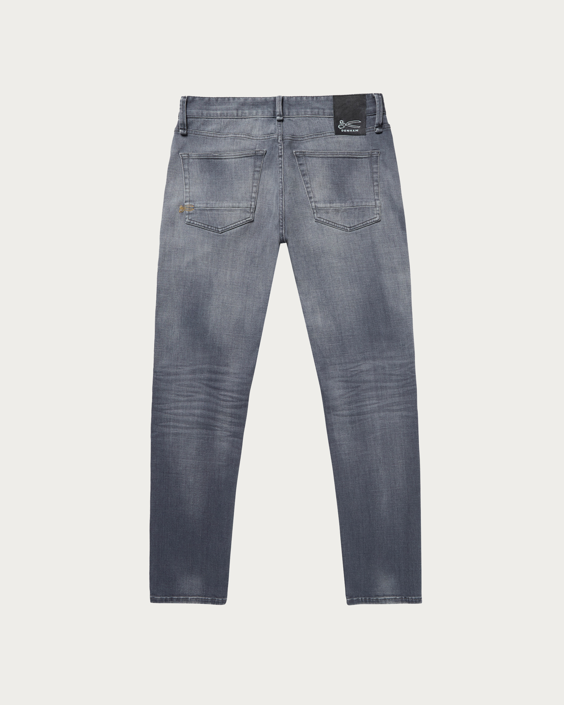 Slim fit jeans model RAZOR. Gemaakt van zachte 12 oz Candiani left-hand denim in grijs met subtiele wassing en tonale stiksels. Moderne, slanke pasvorm van mid-rise taille tot enkel.