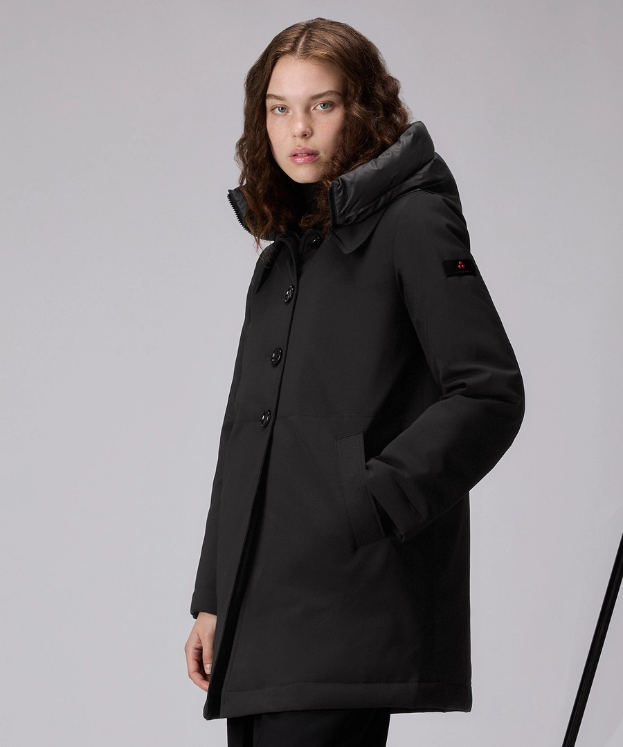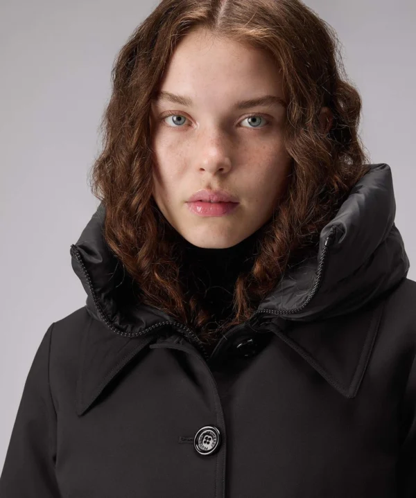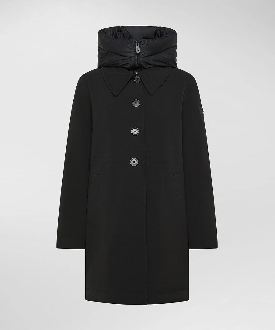 Hoogwaardige jas met een klassieke kraag en knopen. Gerecyclede stretch polyesterstof met twilltextuur en een strakke, matte look. Een lichte coating maakt de stof af, verbetert de donsafdichting en voegt een zachte textuur en wind- en waterafstotende eigenschappen toe. Verbeterd met een vast binnenvest dat zelfs tijdens de koudste dagen warmte en bescherming biedt. De gecertificeerde natuurlijke donsvulling zorgt voor warmte en lichtheid. Klassieke kraag gecombineerd met de grote technische capuchon van het vest voor een sterke, eigentijdse look. Knoopsluiting aan de voorkant en onzichtbare zakken in de zijpanelen voor een elegant kledingstuk, met vernieuwd volume en materialen, perfect om de winter in stijl tegemoet te treden.