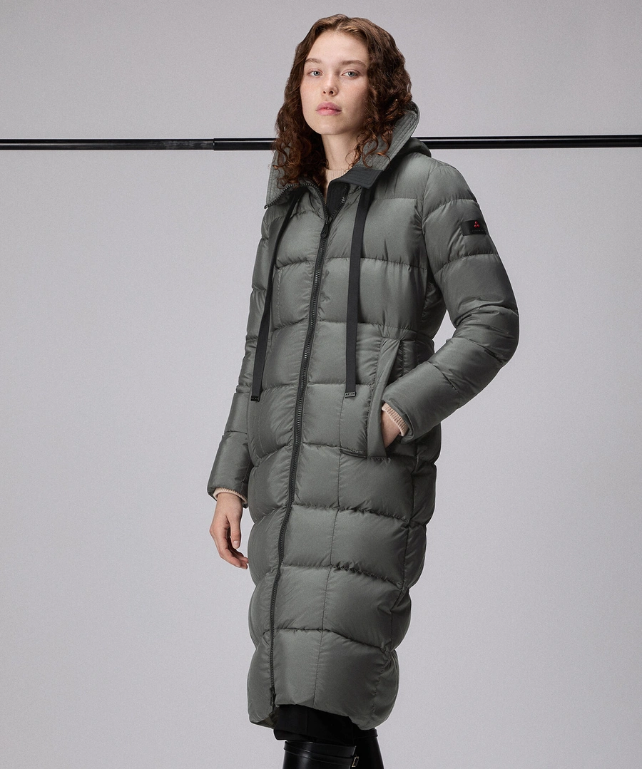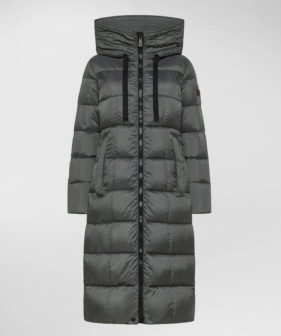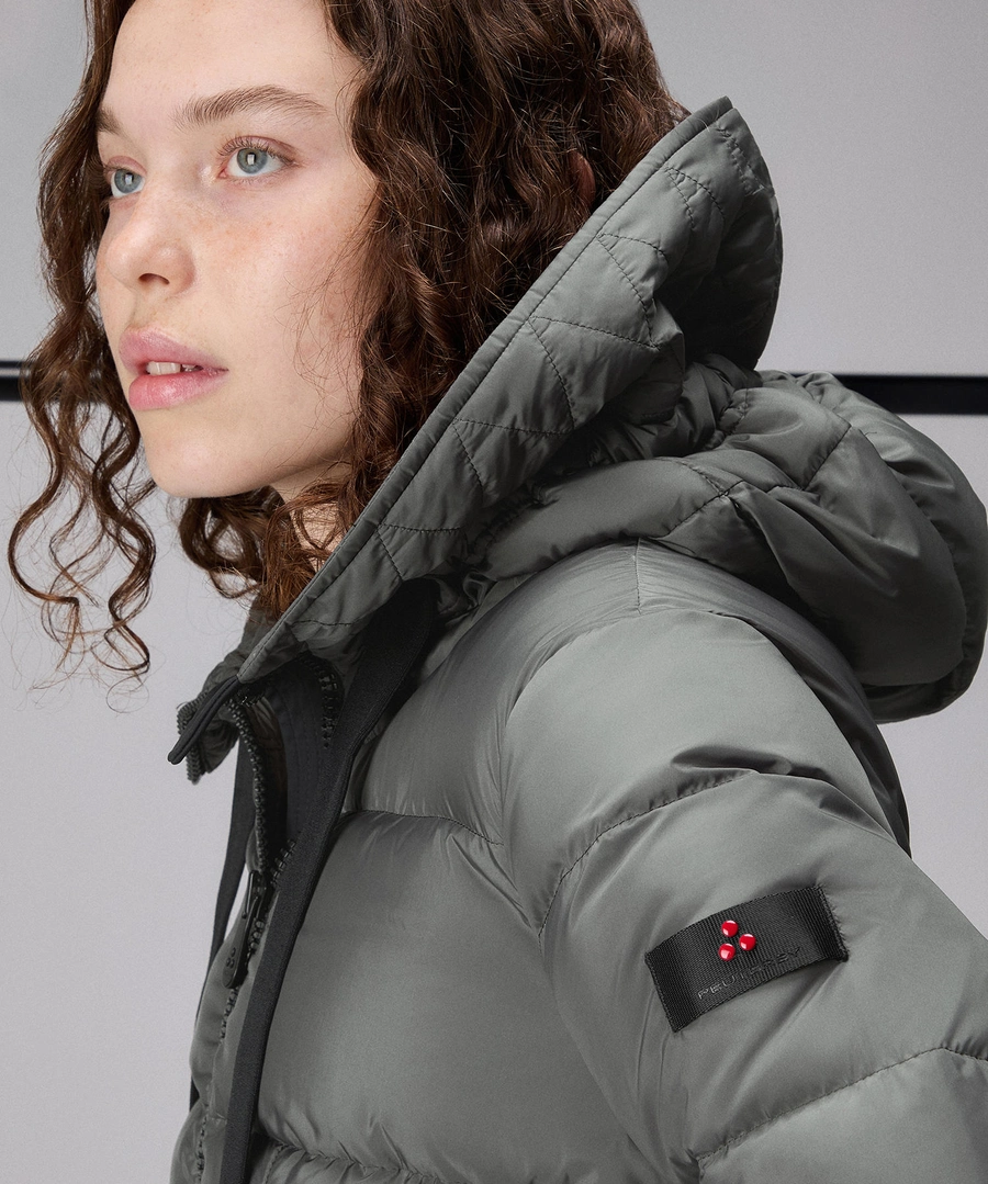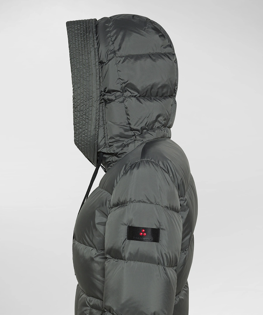Lang gewatteerd donsjack met grote horizontale groeven, gemaakt van 100% gerecycled polyester, voelt zacht aan, heeft een extra compacte structuur en een semi-matte afwerking. De gecertificeerde natuurlijke donsvulling zorgt voor veel warmte zonder te zwaar te zijn. De technische details – hoge kraag, verstelbare vaste capuchon, ritssluiting met dubbele schuif en grote zijzakken – maken het nog praktischer. Waterafstotende PFC-vrije behandeling, die bescherming biedt tegen lichte regenval, zonder schadelijke chemicaliën. Voor een comfortabele en toch stijlvolle look.