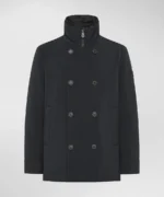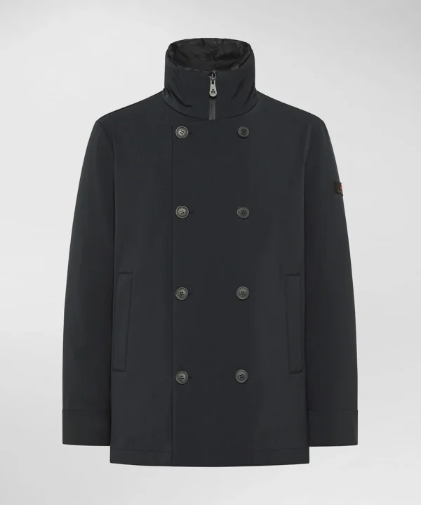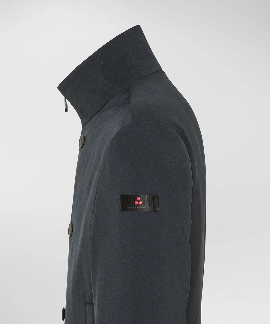 Dubbelrij jas van gerecycled stretchpolyester met een twillstructuur en een strakke, matte uitstraling. De lichte coating aan de achterkant geeft de stof textuur en zachtheid, verbetert de waterafstotendheid en zorgt voor winddichte en waterafstotende eigenschappen. De dubbelrijige knoopsluiting met een zwarte verborgen dubbele ritssluiting wordt gecombineerd met een opstaande kraag en grote zijzakken, in een urban en eigentijds ontwerp. De natuurlijke donsvulling zorgt voor ideaal thermisch comfort in het winterseizoen. Een urban herinterpretatie van een klassieker voor heren, perfect om het koude seizoen met stijl en functionaliteit tegemoet te treden.