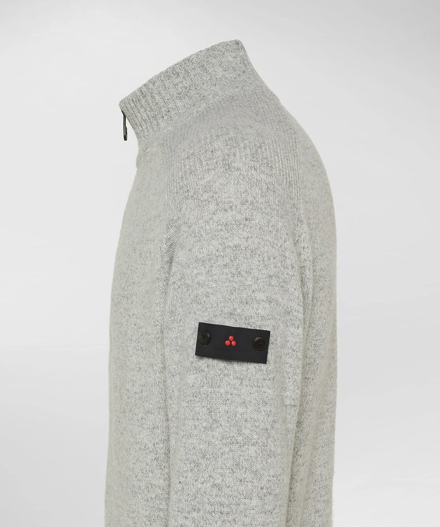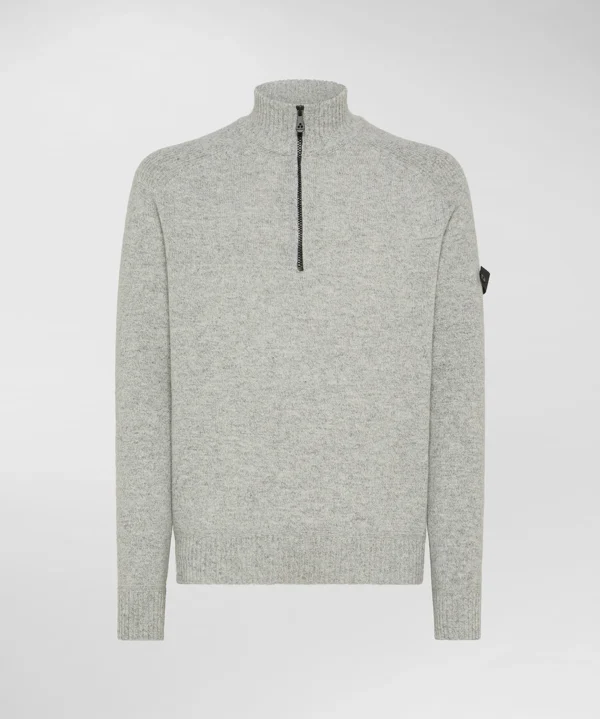 Gebreide trui met halve rits en opstaande kraag, gemaakt van een gemêleerde wolmix. Het verfijnde melange-effect van het garen zorgt voor kleurdiepte en een verfijnde uitstraling. Details zoals de geribde kraag, manchetten en onderkant versterken de constructie van het kledingstuk en benadrukken de comfortabele pasvorm. Het Peuterey trilogy-logo – het iconische symbool van het merk – is met twee delicate knoopjes op de linkermouw aangebracht. Dit herenmodel zal dankzij zijn gedurfde en veelzijdige stijl een geliefd seizoensmust-have worden.