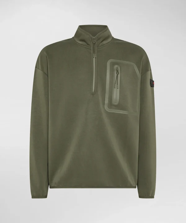 Sweatshirt van scuba, een technische stof die zich kenmerkt door een compact en elastisch gevoel, ideaal voor dagelijks comfort. Het praktische en eigentijdse ontwerp wordt gekenmerkt door een opstaande kraag, een halve ritssluiting en een opgestikte borstzak met ritssluiting en rubberen biezen. Geribde details aan de onderkant en manchetten zorgen voor een comfortabele en goed gedefinieerde pasvorm, ideaal voor dagelijkse bewegingen. Het logo van Peuterey, bevestigd met twee knopen op de linkermouw, geeft het kledingstuk een subtiele uitstraling. Een sportief en modern kledingstuk om toe te voegen aan je garderobe, voor een casual, comfortabele look.