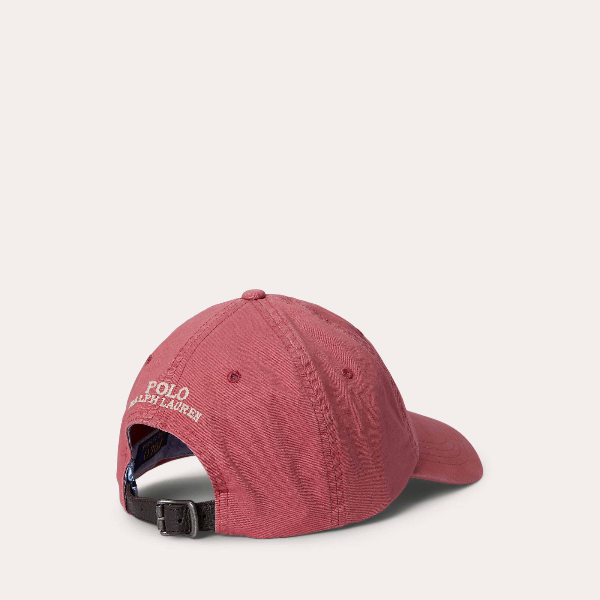 Deze elastische katoenen keper-pet heeft aan de voorkant Ralph Lauren’s veelkleurige, kenmerkende geborduurde Pony en een leren riem met gesp aan de achterkant.