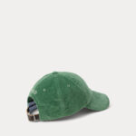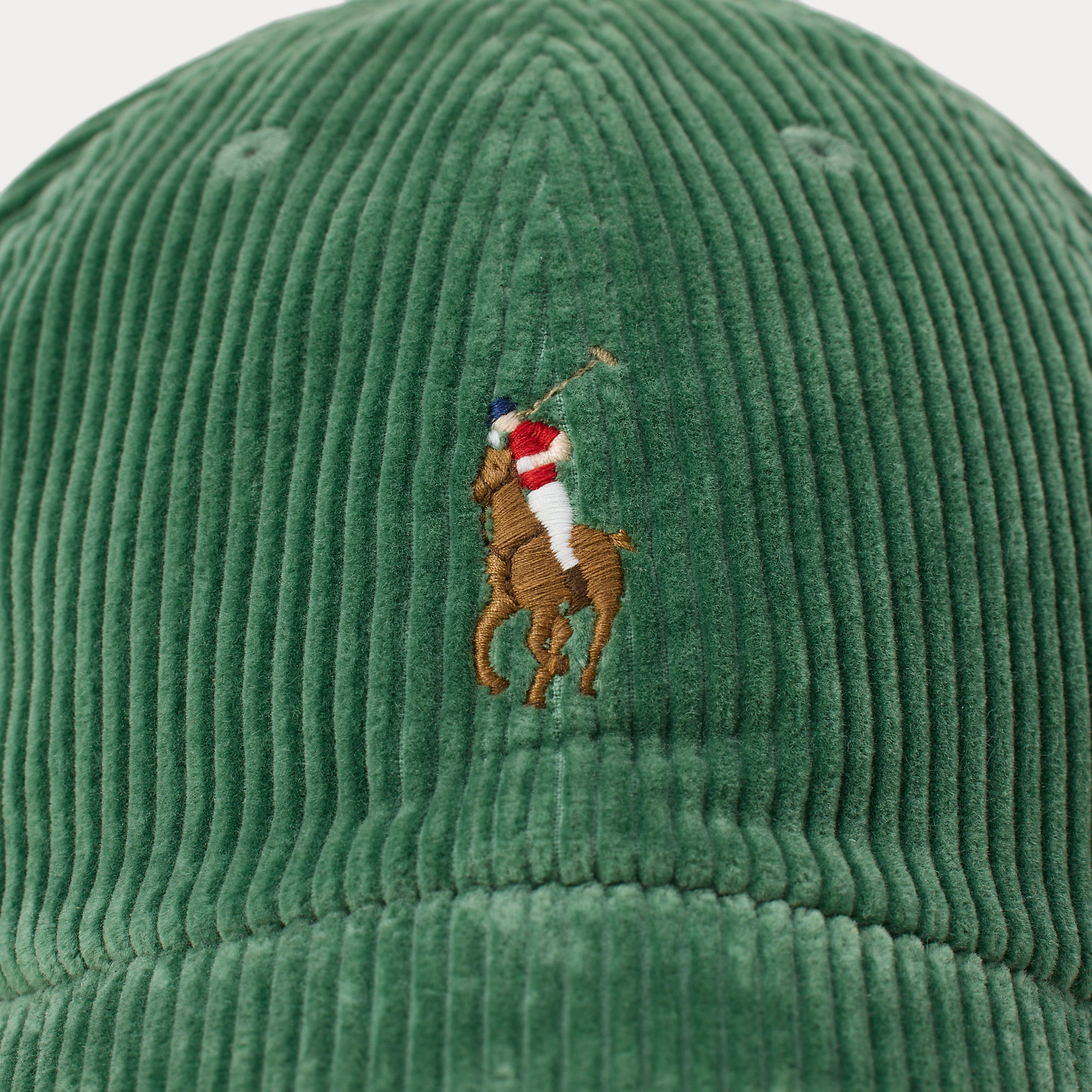 De veelkleurige, geborduurde pony, het kenmerk van Ralph Lauren, accentueert deze corduroy baseballpet, die aan de achterkant is afgewerkt met een leren riempje met gesp.