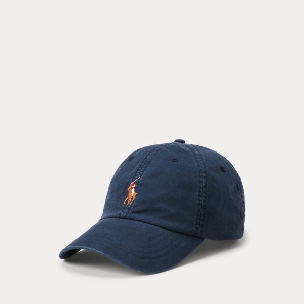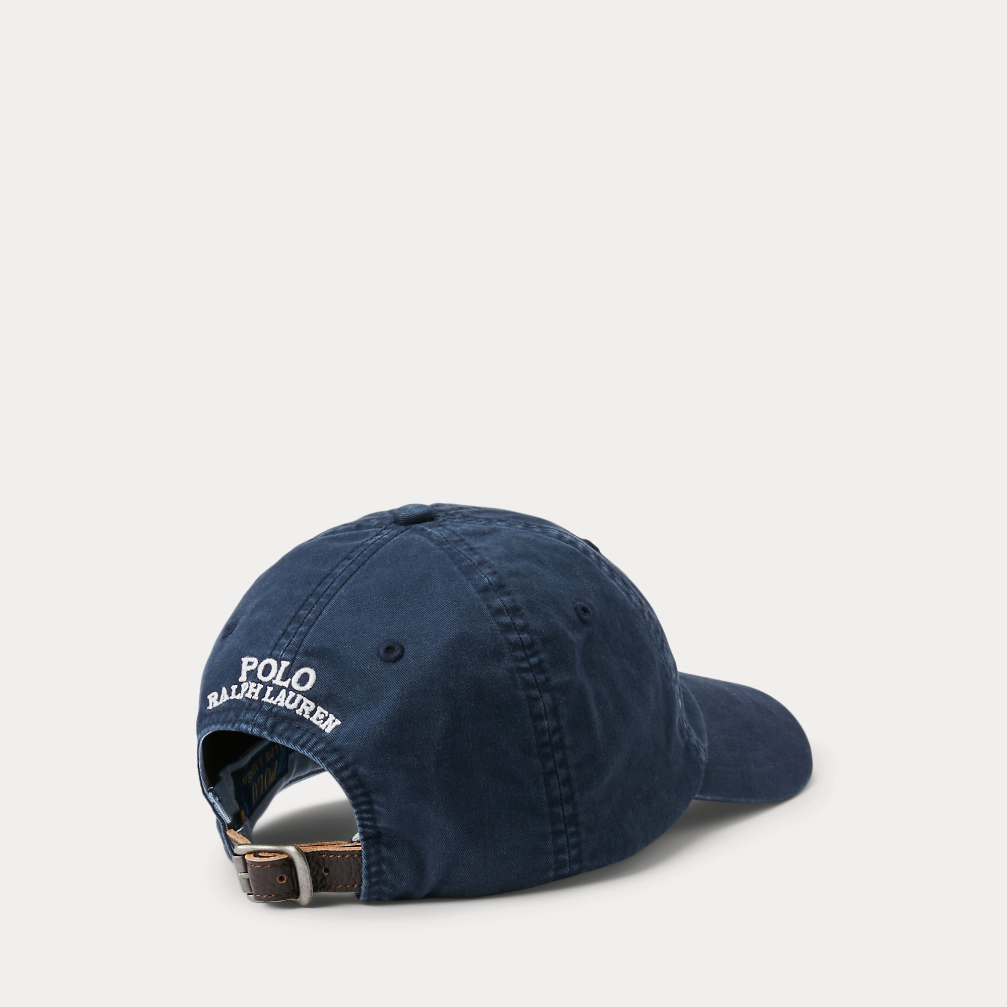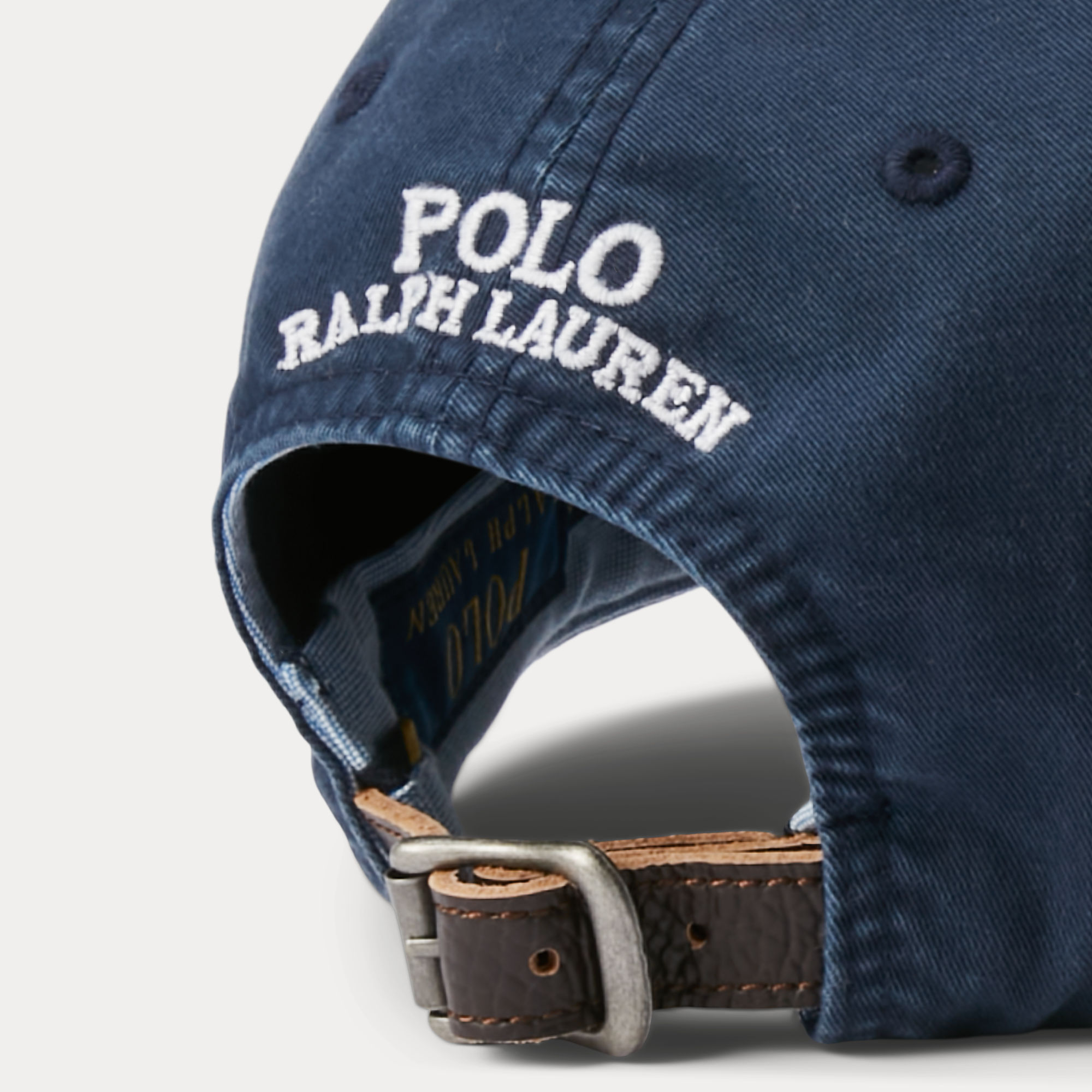 Deze elastische katoenen keper-pet heeft aan de voorkant Ralph Lauren’s veelkleurige, kenmerkende geborduurde Pony en een leren riem met gesp aan de achterkant.