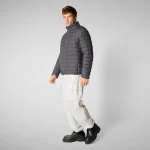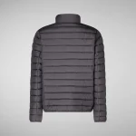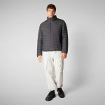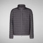 Heren donsjack, model Cole van Save the Duck. Deze stijl heeft een isolerende hoge hals, een geritste voorkant en elastische manchetten en zoom voor een comfortabele pasvorm. Uitgerust met lage ritszakken en een borstzak met rits, is het gewatteerd met GERECYCLEDE Plumtech®, ons diervrije alternatief voor dons.